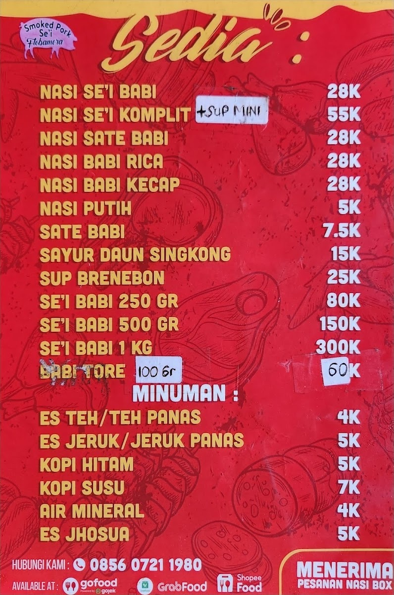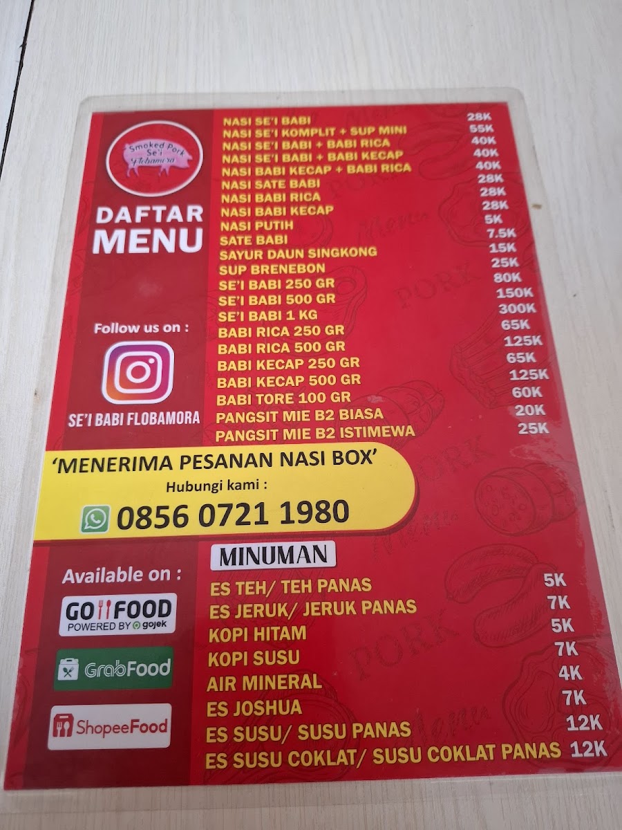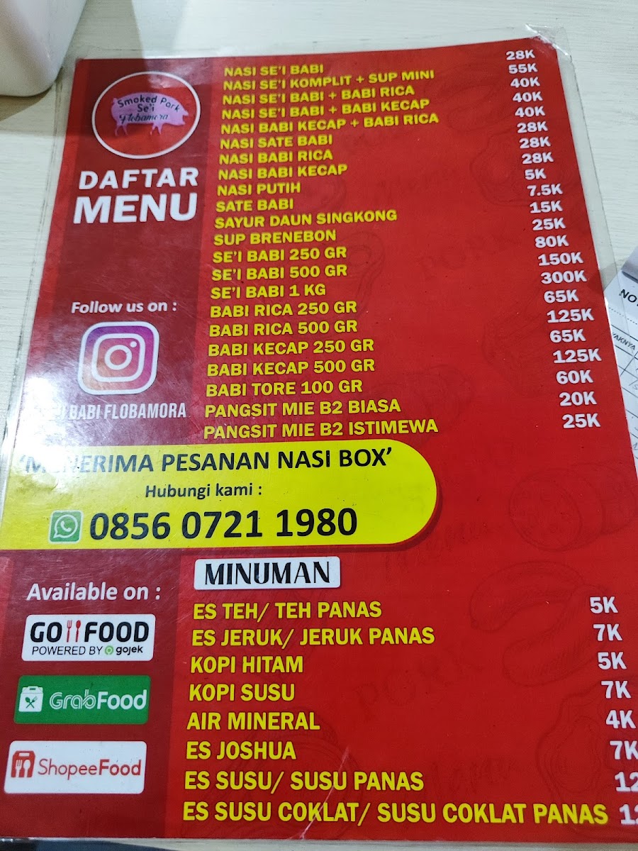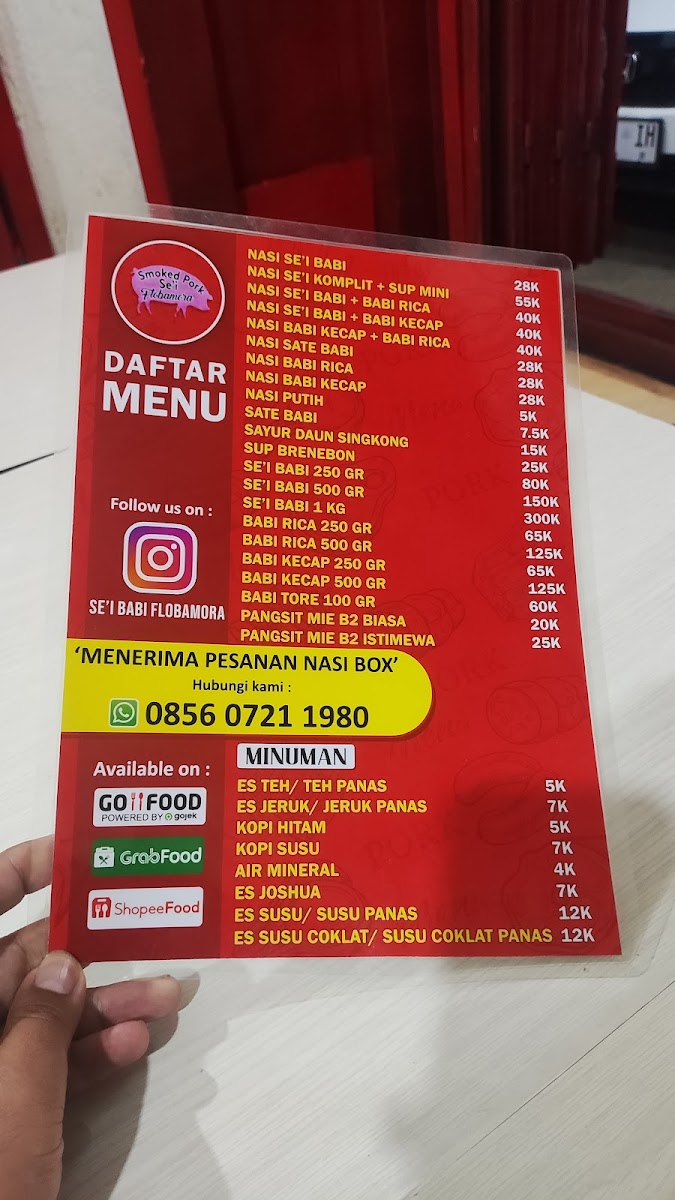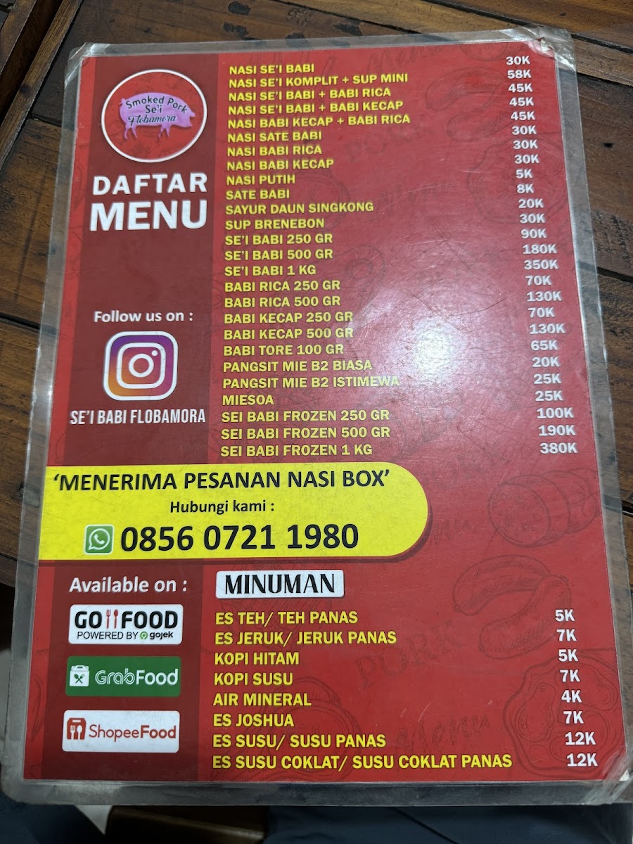 SE'I BABI FLOBAMORA (SMOKE PORK) is a hidden gem in Malang, serving authentic Kupang-style smoked pork that elevates traditional Indonesian flavors. Located conveniently in front of SMAK Frateran, this cozy spot offers a menu focused on slow-smoked pork, prepared with care and passion. The star dish, Se’i Babi, is smoked pork meat that undergoes at least two hours of smoking, giving it a distinctive smoky aroma and tender texture.